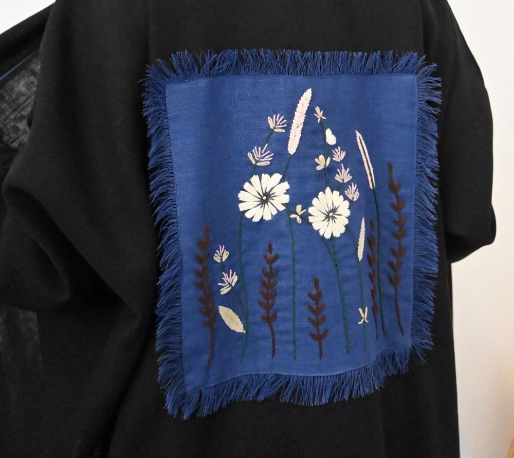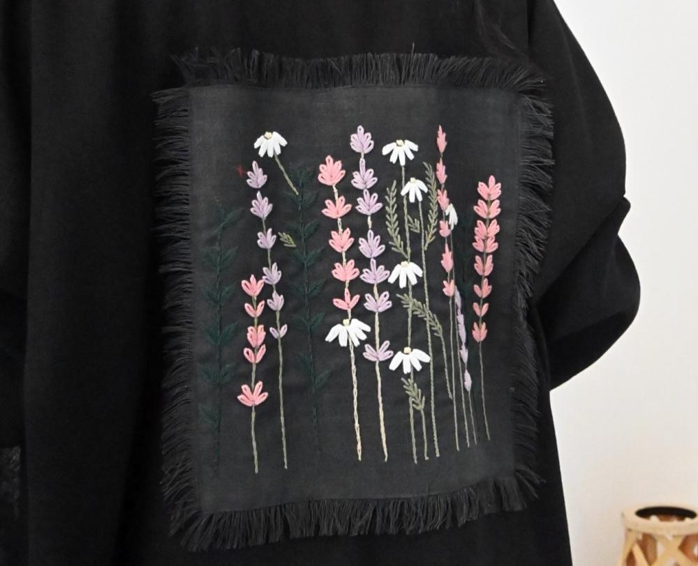عباية نص كلوس بقماش اللينن المتوسط الثقل بتطريز يدوي على قماش لينن مختلف اللون في الخلف على شكل مربع