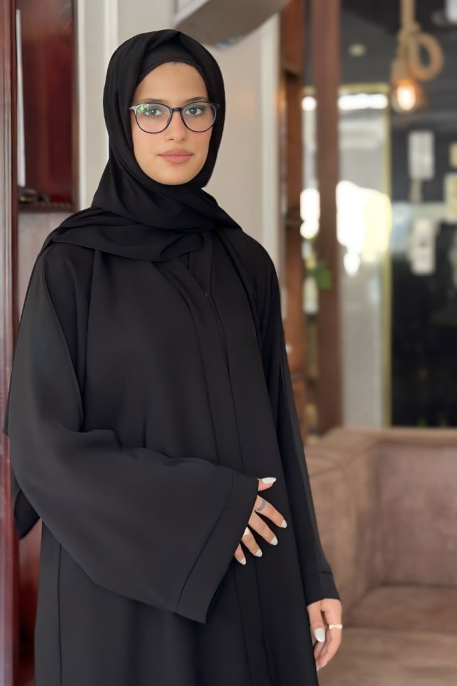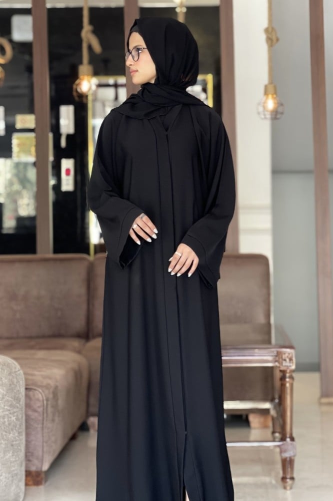 عباية قصة عادية بقماش الكريب الكوري السادة بأكمام وسط بمرد في الأمام والأكمام . مقفلة بطقطق.